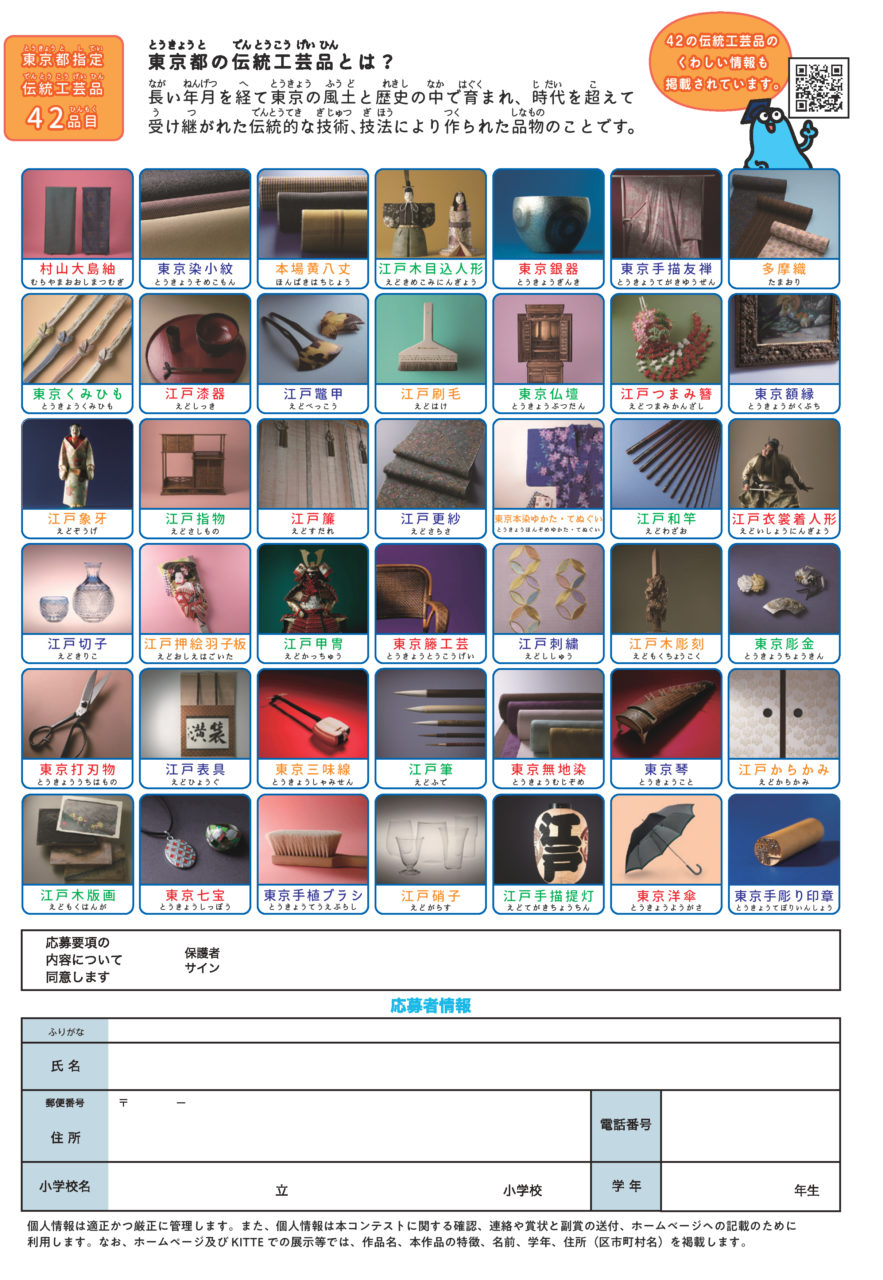 またご応募いただいた全ての応募作品を、令和7年10月31日(金)~11月4日(火)に千代田区丸の内「KITTE」で開催される伝統工芸品のイベント「KOUGEI LOVERS」会場にて展示を行いますとともに、入賞作品の表彰を行う予定です。」