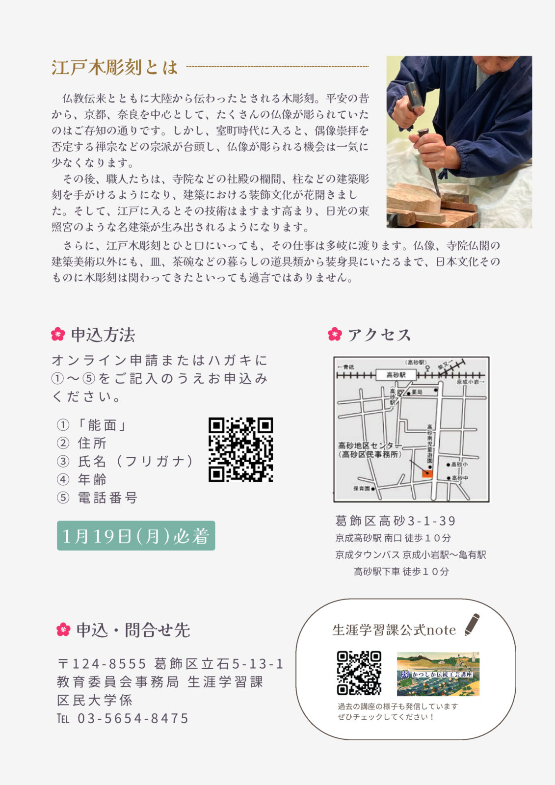 葛飾区の生涯学習講座「かつしかの伝統工芸」にて「能面から見る職人の技」として江戸木彫刻北澤秀太が登壇いたします。